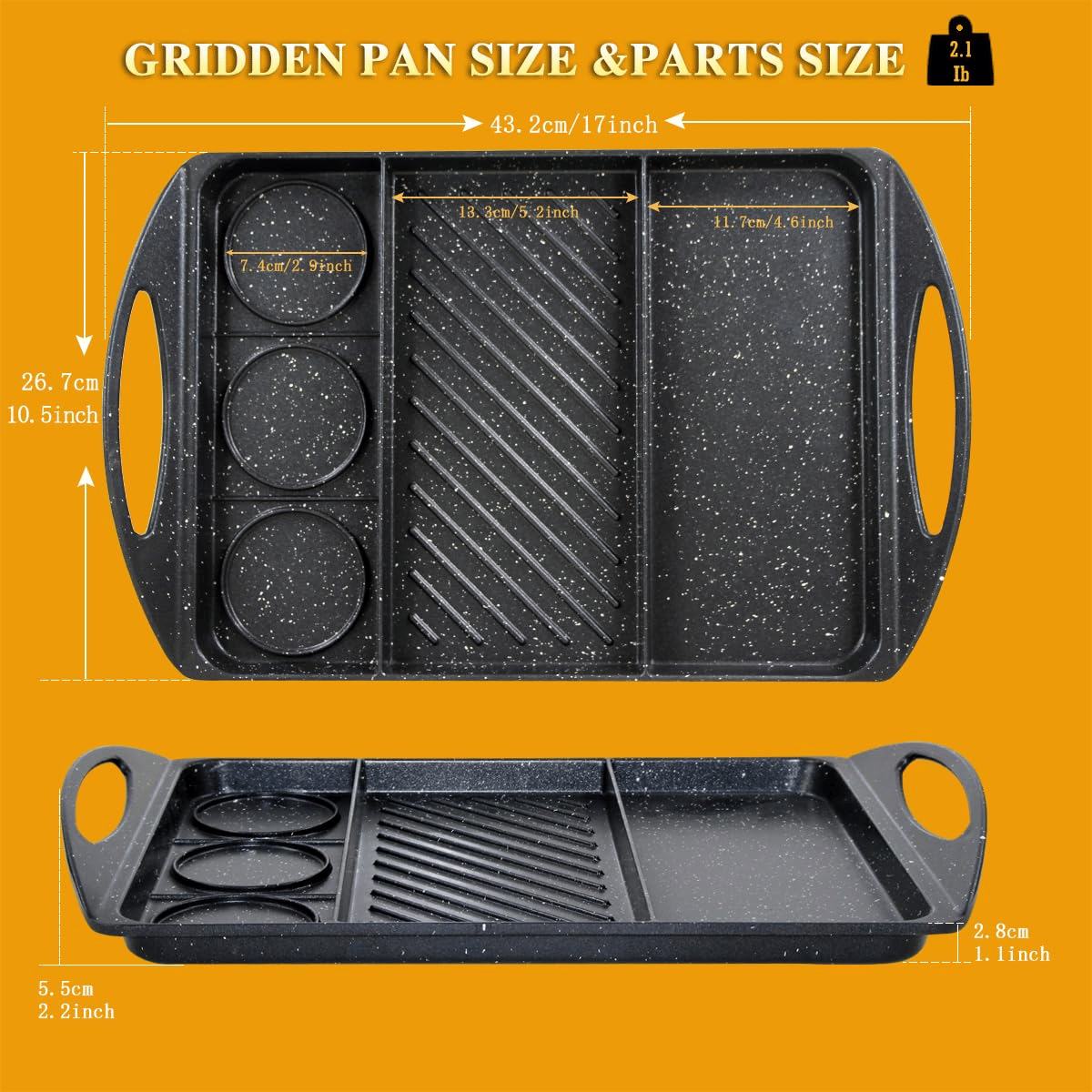 1.EASY TO CARRY AND STORE NOT WARP: This griddle pan double layer aluminum alloy die casting design ensures the pan will not warp due to uneven heating. Size: 17" x 10.5" to Work great with all stoves top, oven safe up to 500°F,it's so easy to transform your indoor gas or induction cooktop into a grill top.This griddle only 2.2 lb,is lighter in weight and easier to carry than traditional cast-iron cookware.It's fast in heat transfer.This griddle is ideal for BBQ,pan frying,searing,and more.