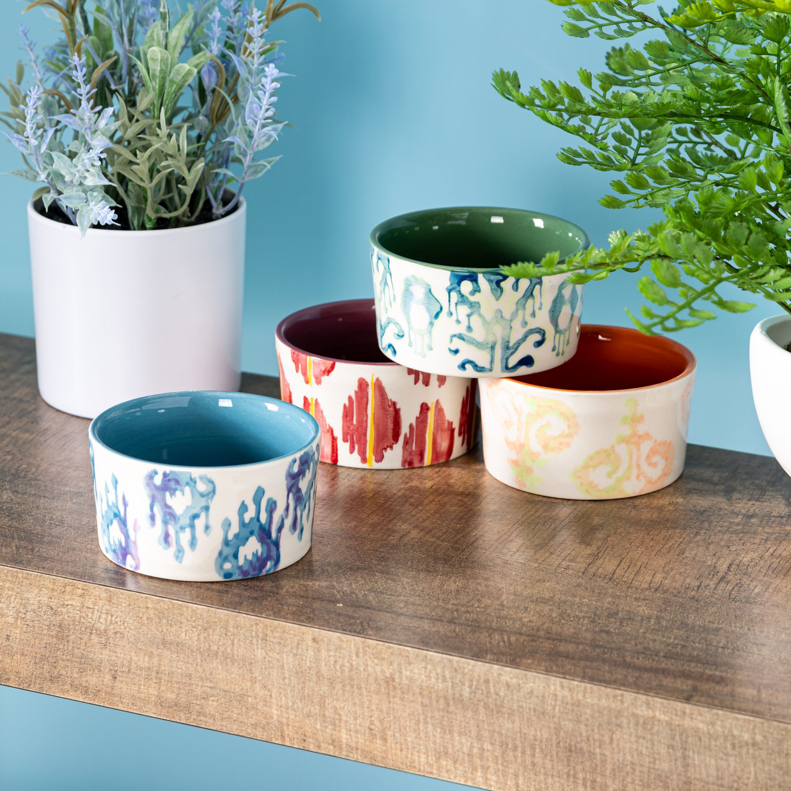 Material: StonewareFinish: High GlossShape: RoundColor: Multi-colorMicrowave SafeDishwasher SafeOven SafeSet Includes: Four 6.5 oz. RamekinsRamekin Dimensions: 3.75″ diameter, 2″ height, 6.5 oz. capacity, 0.45 lb weight