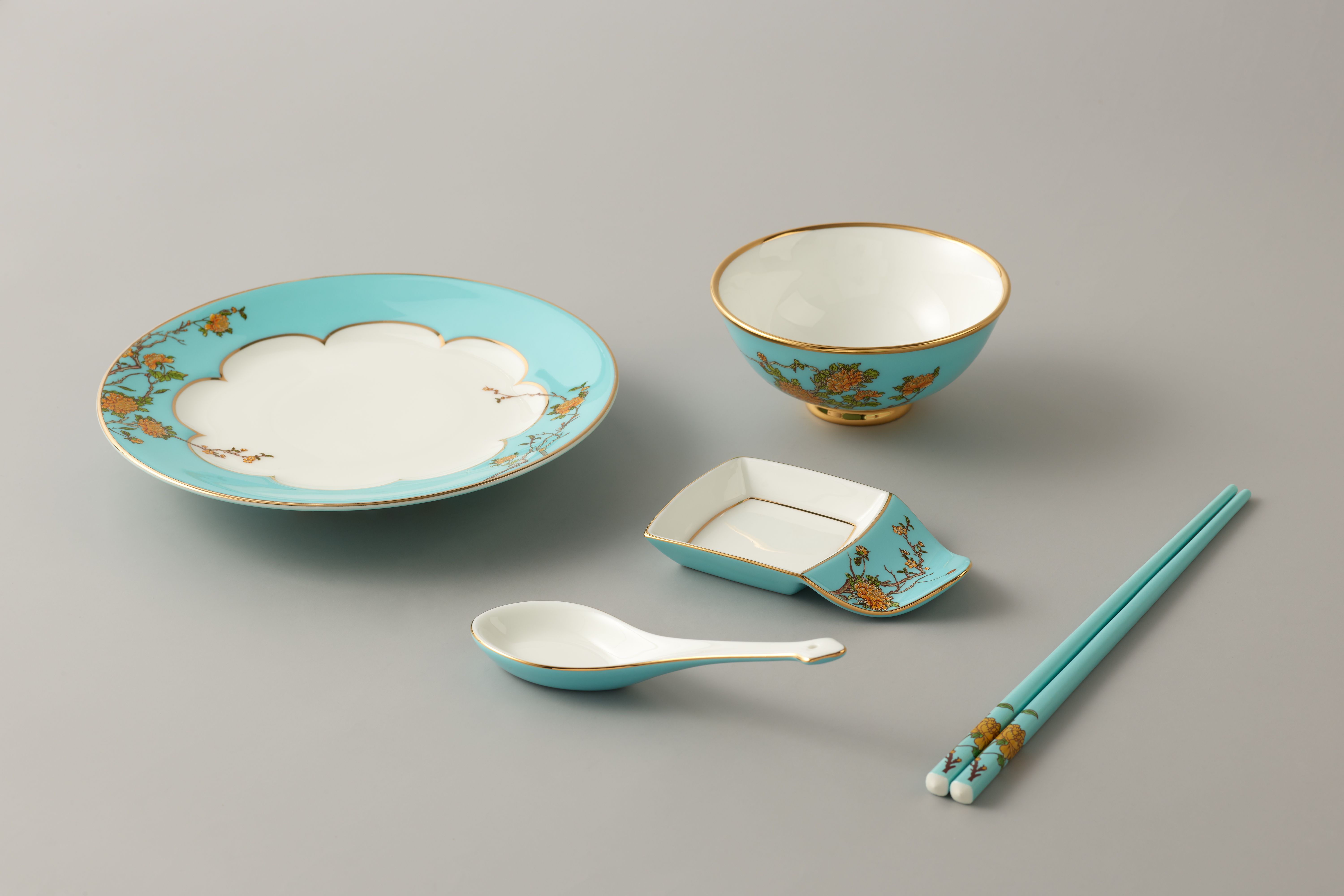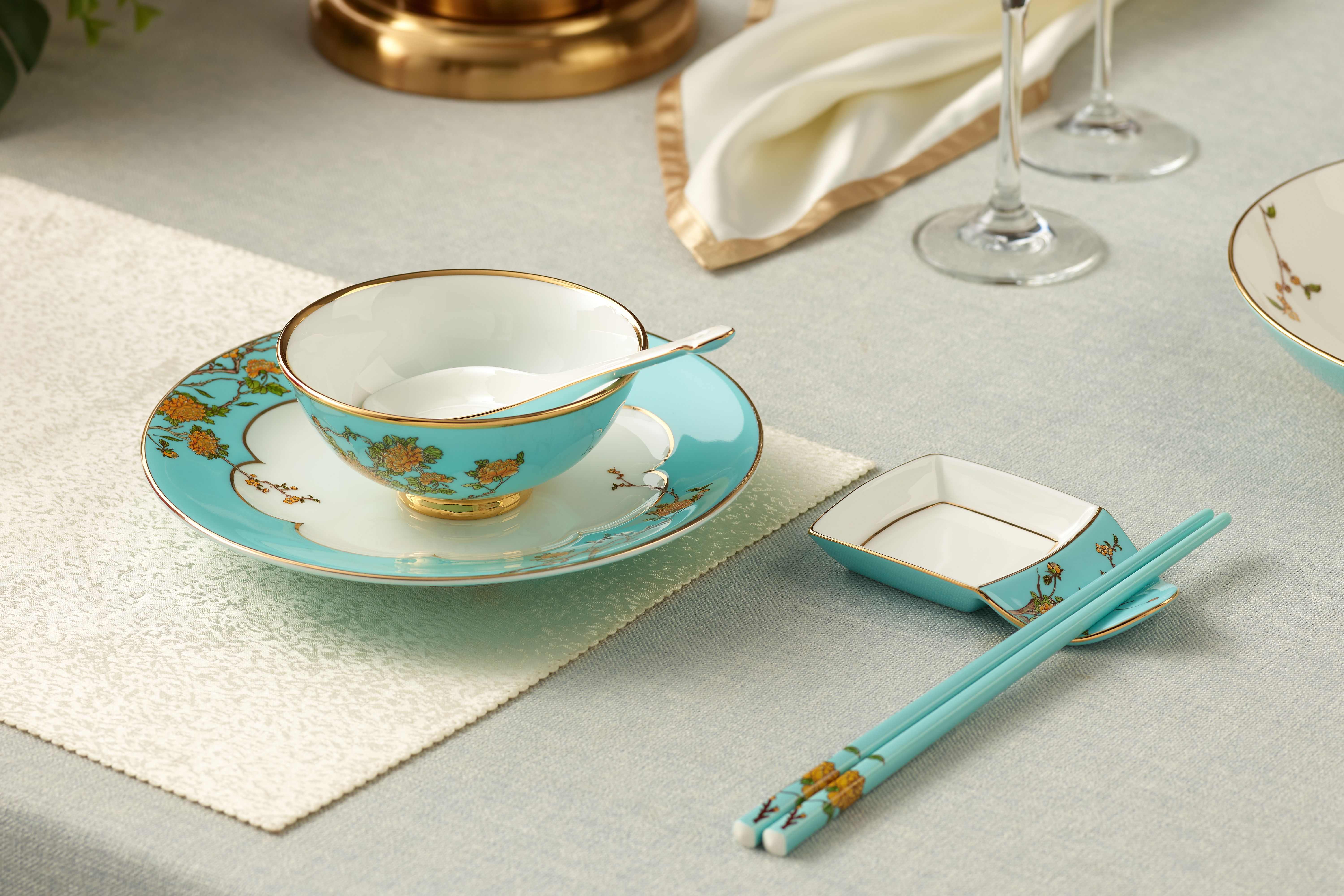 4.CERAMIC TABLEWARE SET INCLUDES - 205mm plate x 1, 120mm bowl x 1, 121mm saucer dish x 1, 140mm spoon x 1, 1 pair of chopsticks.