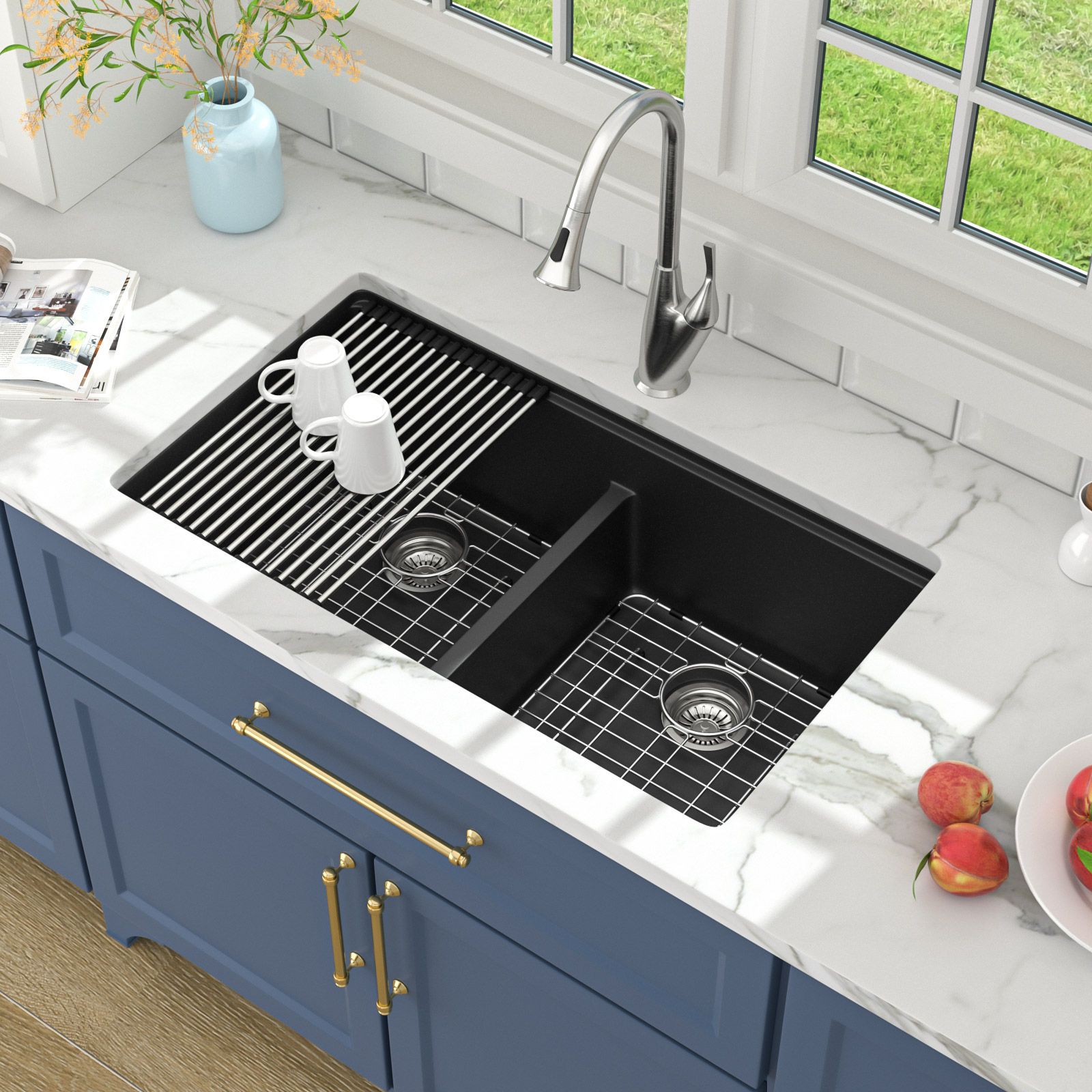 4.Noise Reduction - the 33 in. double bowl undermount kitchen sink is made of thick stone material, designed to reduce vibration and noise when using the sink, never interrupting your conversations with your family